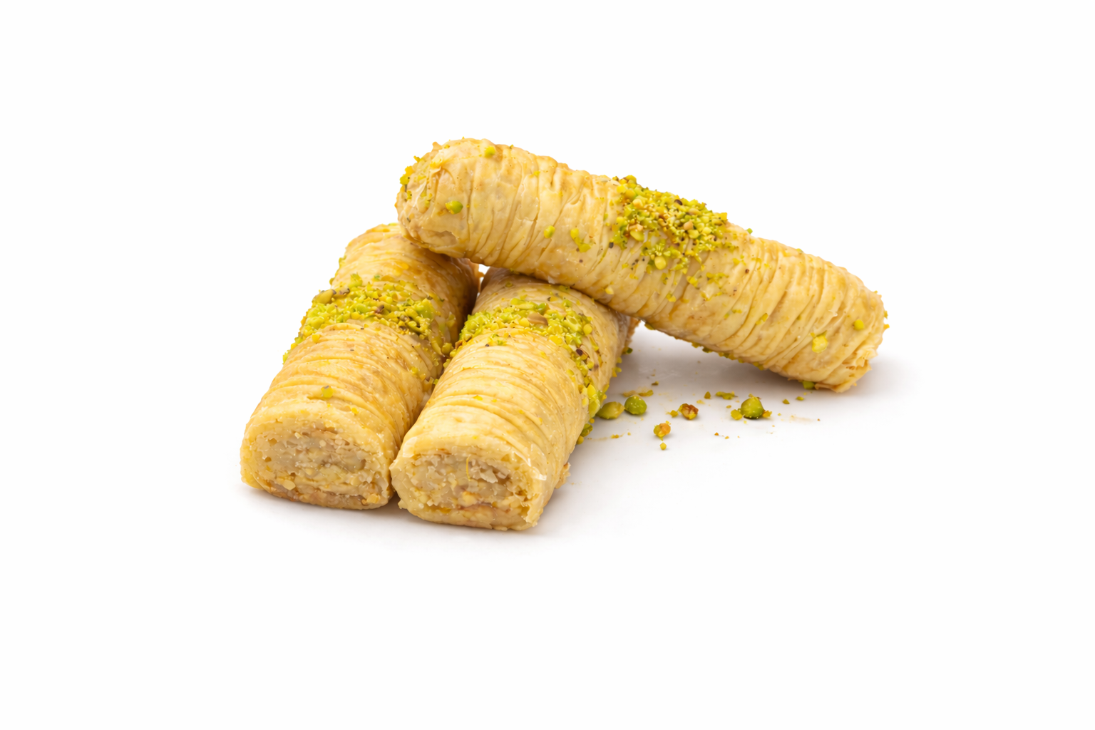 Hand crafted Mediterranean pastries made from thin layers of filo pastry, filled with almonds and cashews, skillfully baked and topped with sweet syrup.