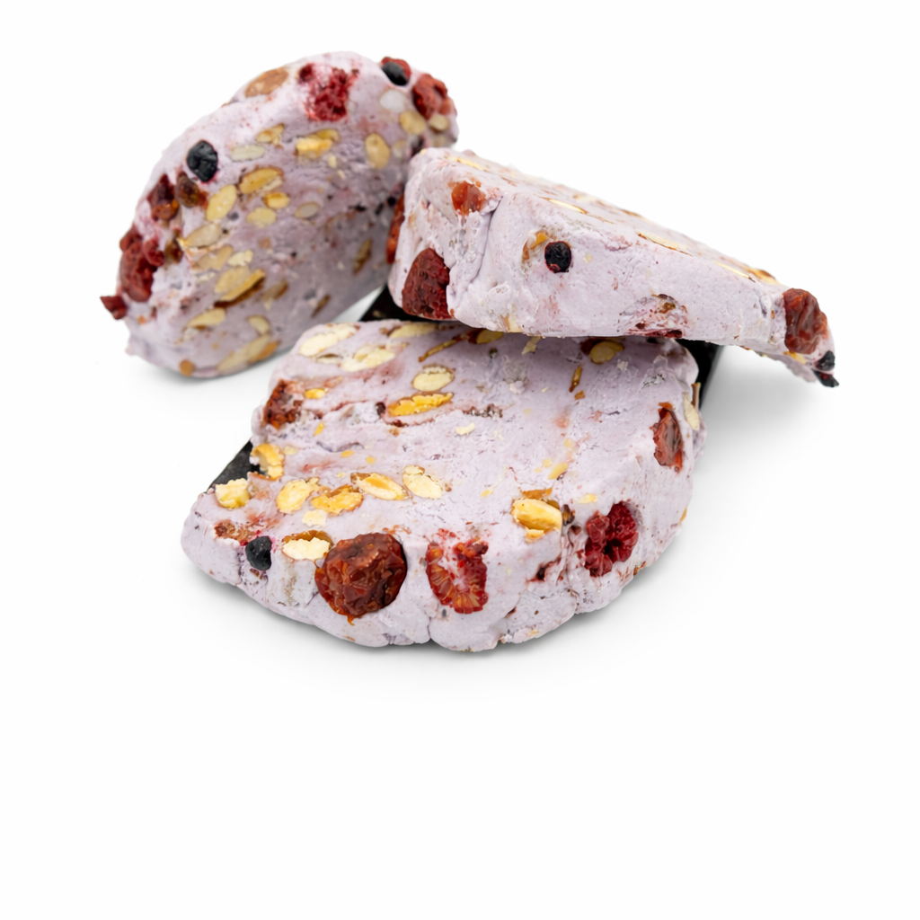 🫐 🍒 A chewy Italian nougat bursting with the natural flavors of forest fruits cranberries, blueberries, and raspberries blended with crunchy nuts for a fruity and nutty indulgence.