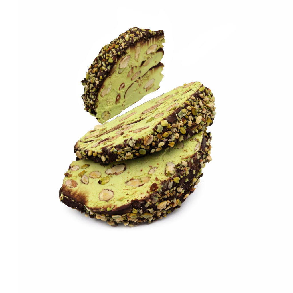 ALMONDS 39% (TREE NUTS), sugar, glucose syrup, honey, cioko dark (sugar, hydrogenated vegetable fat, fat cocoa powder (16%), emulsifier: lecithin SOY (SOY), flavoring: vanilla powder), EGGS white (EGGS), PISTACHIOS 4% (TREE NUTS), wafer (potato starch, water, oil (E141)), PISTACHIOS essential oil flavoring (TREE NUTS), green vegetable coloring (E141ii copper chlorophyll).