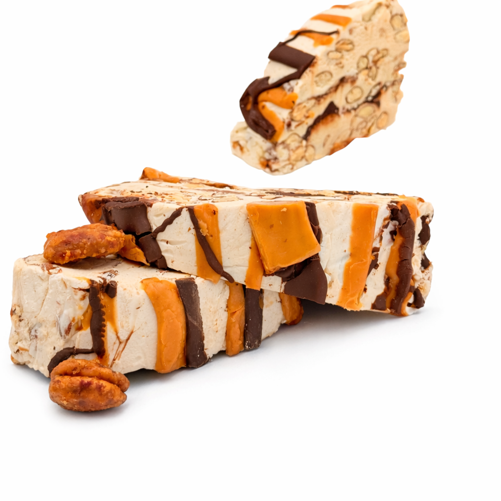 ✨ A luxurious dark chocolate nougat with a rich, buttery flavor and a hint of salt, offering a perfect balance of sweet, savory, and creamy indulgence in every chewy bite.