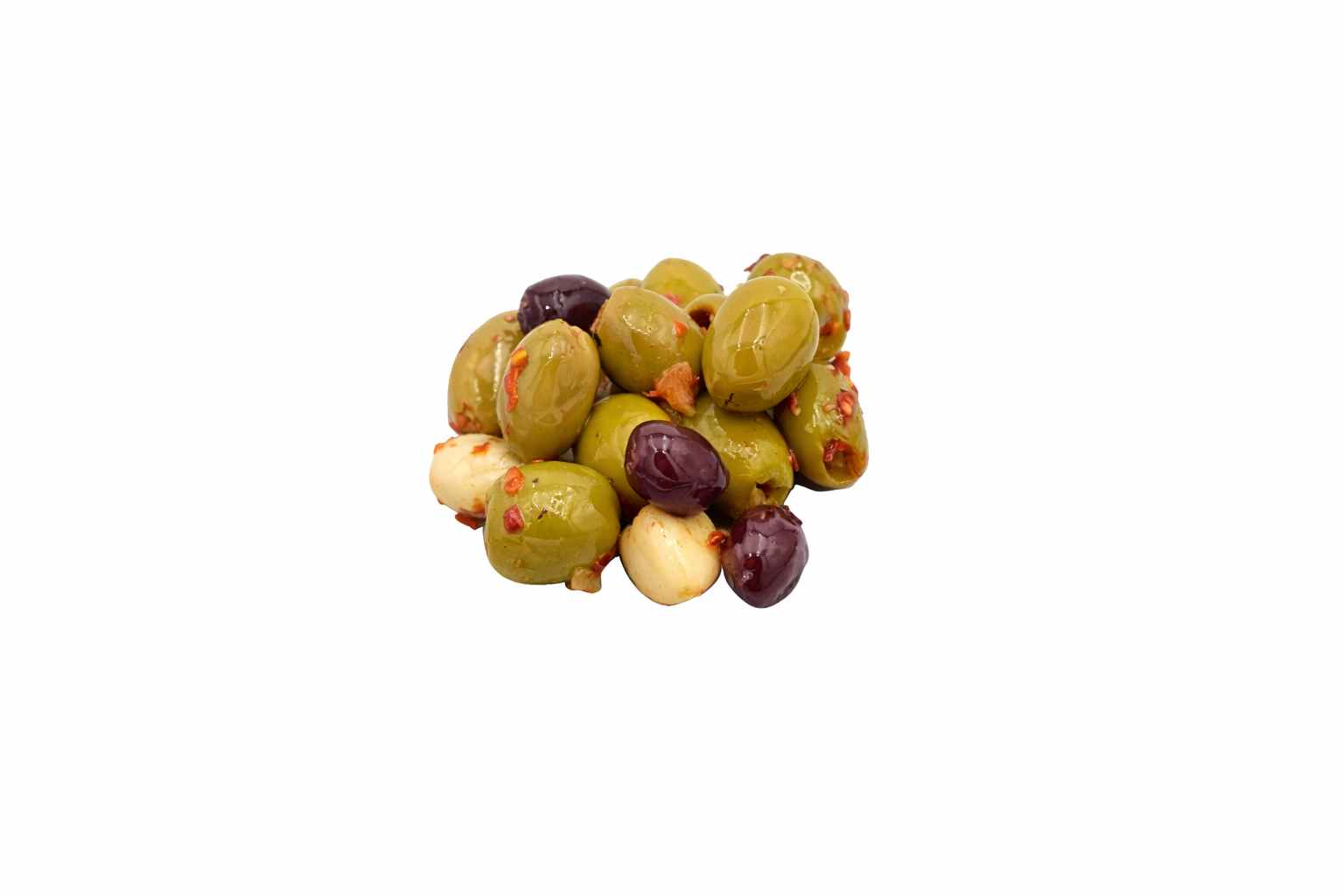 Green Olives, pickled Garlic, crushed chilli, minced Garlic, Vegetable Oil, Kalamata pitted.